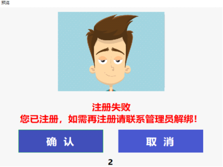 如果对拍照预览图不满意,可点击取消(默认10秒自动取消),然后按前面的第一到第三步重新操作一遍。如果已注册用户,再次注册时会失败(图1.6注册失败),并提示“您已注册,如需再注册需联系管理员解绑”