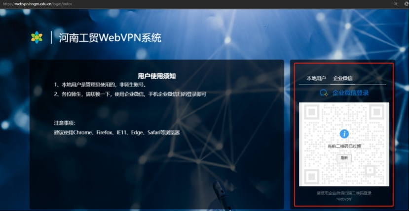 第一步,访问https://webvpn.hngm.edu.cn/login/index,并用用企业微信扫描二维码登录