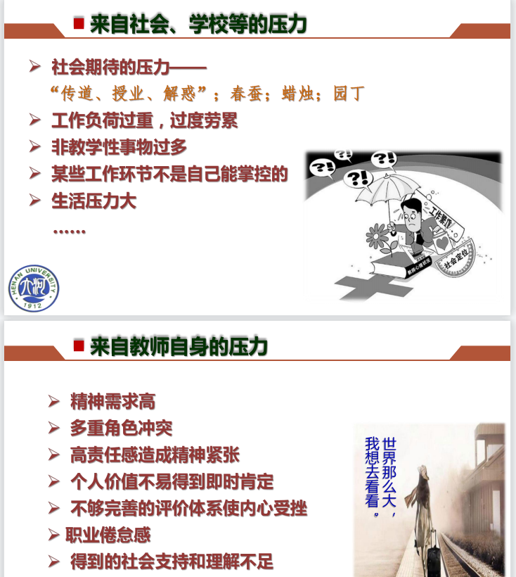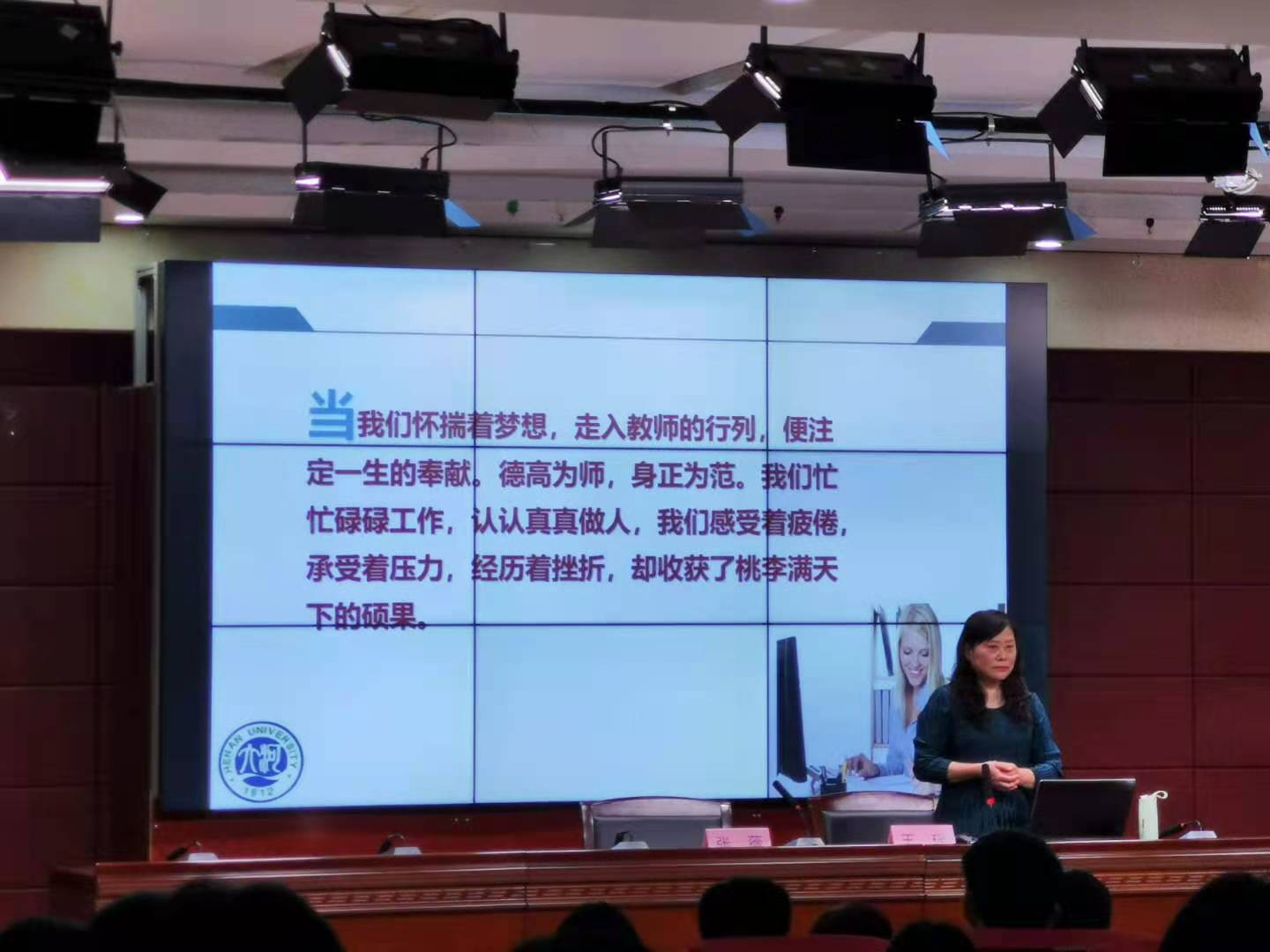 王老师以“当我们怀揣着梦想,走入教师的行列,便注定一生的奉献。德高为师,身正为范。我们忙忙碌碌工作,认认真真做人,我们感受着疲倦,承受着压力,经历着挫折,却收获了桃李满天下的硕果。”开场,分析了高校老师的压力是什么?从哪里来?引起了与会者的共鸣,进而结合自身经验,勉励大家从增强职业认同感、与时俱进把握时代脉搏、把握好工作和家庭生活的边界、加强与家人的情感沟通、树立积极的生活理念、管理好自己的情绪等6个方面做好心理纾解,收获愉悦幸福人生。