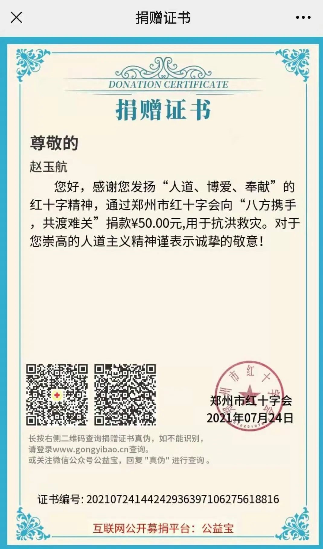 7月20日,赵玉航同学在得知郑州灾情之后第一时间向组织申请出战,可郑州灾情严重,暂时进不去。7月23日晚,该同学得知,自己的家乡洛阳市嵩县组织志愿救灾活动,第一时间选择参加救灾。参加救灾物资的搬运工作,奉献自已的绵薄之力。赵玉航说:“如果祖国需要,我随时可以出战。”