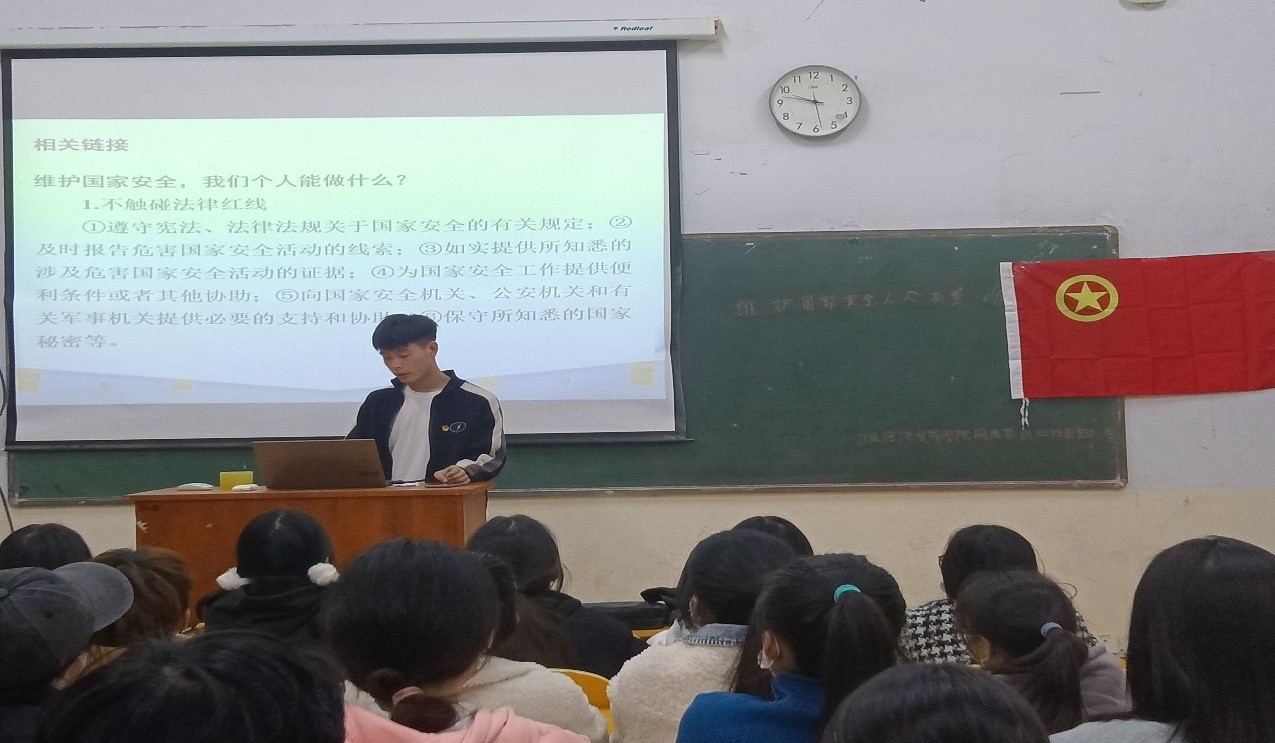 各班团支部书记带领同学认真学习,并解释《反间谍法》颁布的意义及作用,号召大家积极响应,认真学习。同学们在团课过程中专心听讲,回答问题,团课气氛活跃。在深入学习和了解反间谍法案后,大家进行了学习后的交流,表示作为大学生要清醒地认识到维护国家安全和社会政治稳定的严峻性、长期性、尖锐性和复杂性,要进一步增强同学们的国家安全意识和反间防谍意识;作为当代大学生要树立“国家安全、荣誉和利益高于一切”的观念,刻苦学习科学文化知识,把培养起来的爱国之情,贯穿到我们思想之中、贯彻于我们的日常生活之中,从我做起、从现在做起,把我们伟大的祖国建设得更美好。