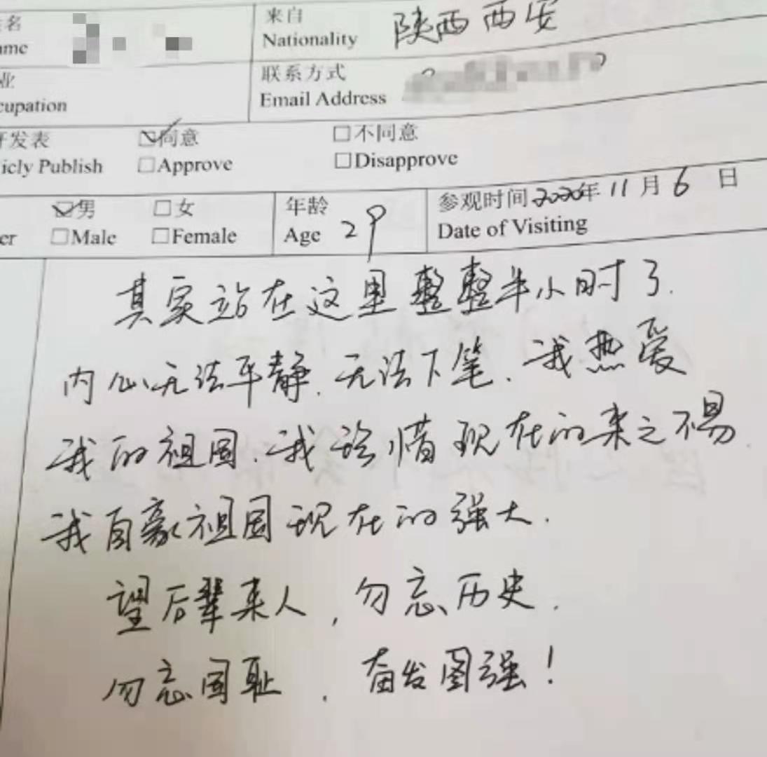 纪念馆工作人员从中抽样统计,解析其中4110名观众留言发现,高频词包括“铭记历史”“珍爱和平”“勿忘国耻”“吾辈当自强”“前事不忘,后事之师”。