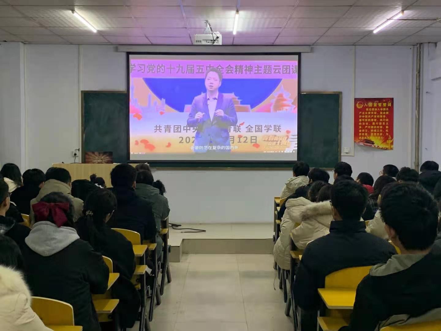为深入学习党的十九届五中全会精神,引导广大团员青年“不忘初心、牢记使命”,激发团员青年的奋斗激情。根据团中央要求,12月12日晚19:00,我校团委组织团员青年收看了“青春新征程 奋进十四五”学习党的十九届五中全会精神主题云团课,采用线上线下相结合的方式,广泛开展学习研讨。