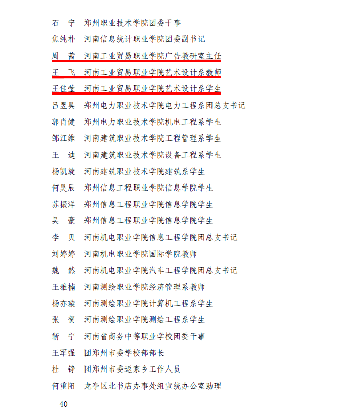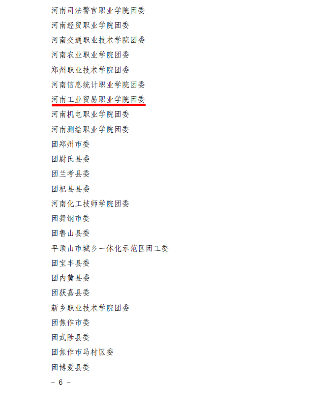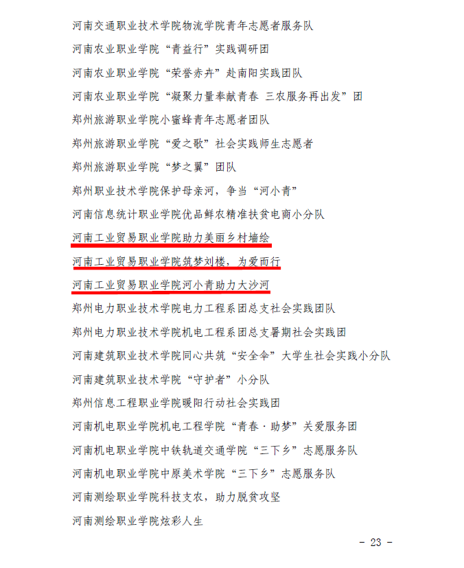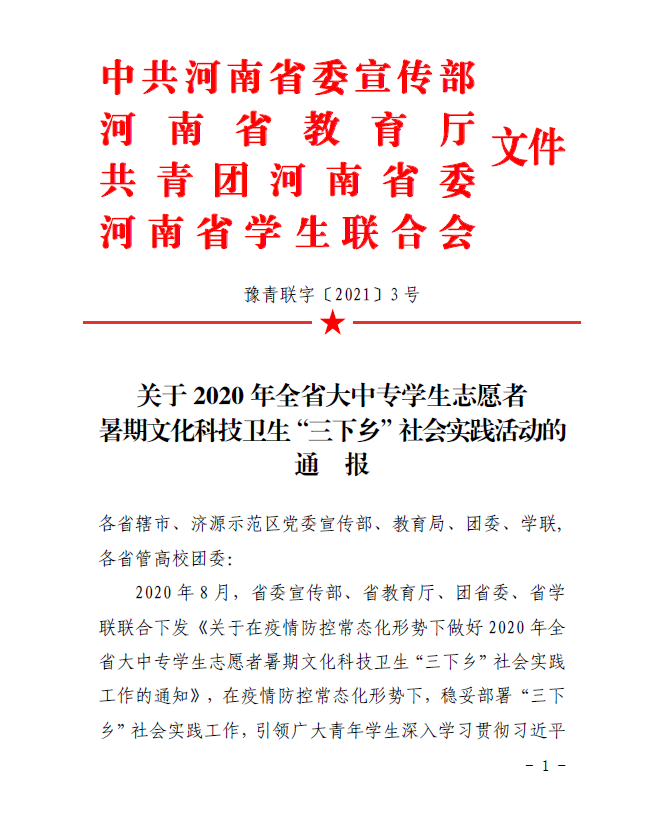 近日,中共河南省委宣传部、省教育厅、团省委、省学联对2020年全省大中专学生志愿者暑期文化科技卫生“三下乡”社会实践活动进行通报。我校团委喜获暑期“三下乡”社会实践活动优秀单位,三个社会实践团队荣获暑期“三下乡”社会实践活动优秀团队,两名教师和一名学生荣获暑期“三下乡”社会实践活动优秀个人。