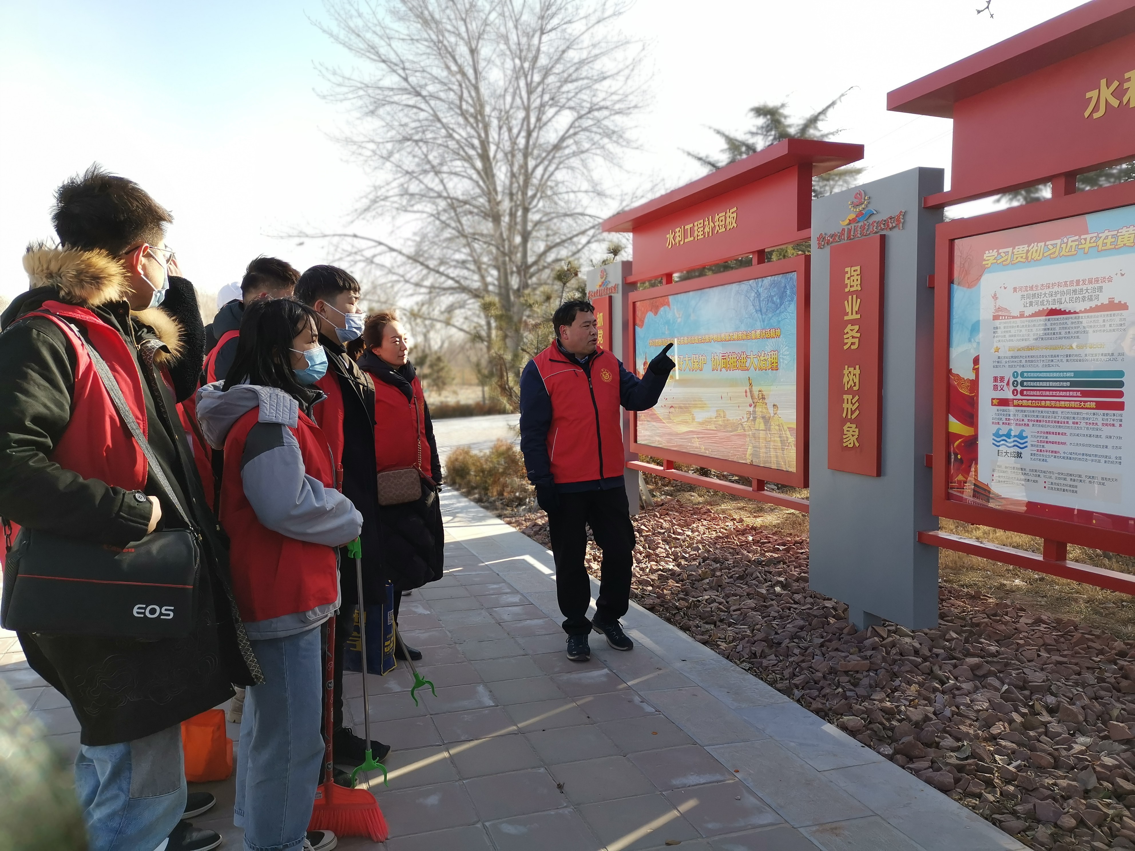 在黄河花园口,志愿者们一起参观了黄河水情长廊。集中学习了20组介绍2500年来黄河概况的科普教育宣传板。从青藏高原的巴颜喀拉山,九曲黄河,奔腾向前,以百折不挠的磅礴气势流经九个省、自治区,注入渤海,塑造了中华民族自强不息的民族品格,是中华民族坚定文化自信的重要根基。在花园口扒口处遗址,张现振带领同学们回顾了1938震惊中外的“花园口事件”。全体志愿者身临其境,接受一次难得的爱国主义教育。