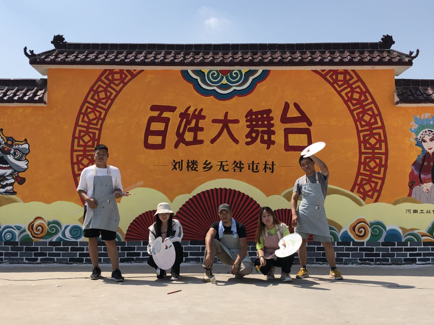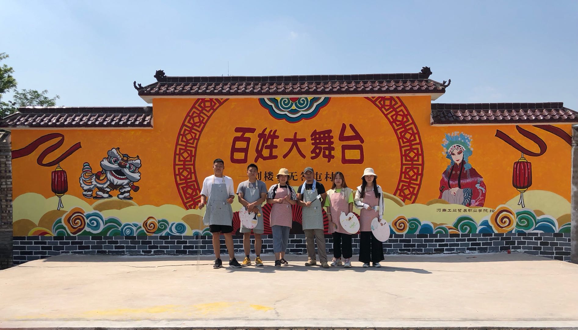 8月25日,艺术设计系教研室主任、专业骨干教师及艺术设计系学生,参加完启动仪式,学院团委书记、宁陵团县委书记、刘楼乡无咎屯驻村第一书记,以及“美丽乡村”服务团师生一同前往宁陵刘楼乡无咎屯村文化广场,实地查看文化墙。队员们当天就投入了紧张的工作中,在为期一周的实践活动中,队员们走基层,访农户,与当地村党员干部群众进行了深入交流,了解村民文化广场舞台背景墙彩绘的需求,累计设计绘制了长12米,高2.6米的广场背景墙。