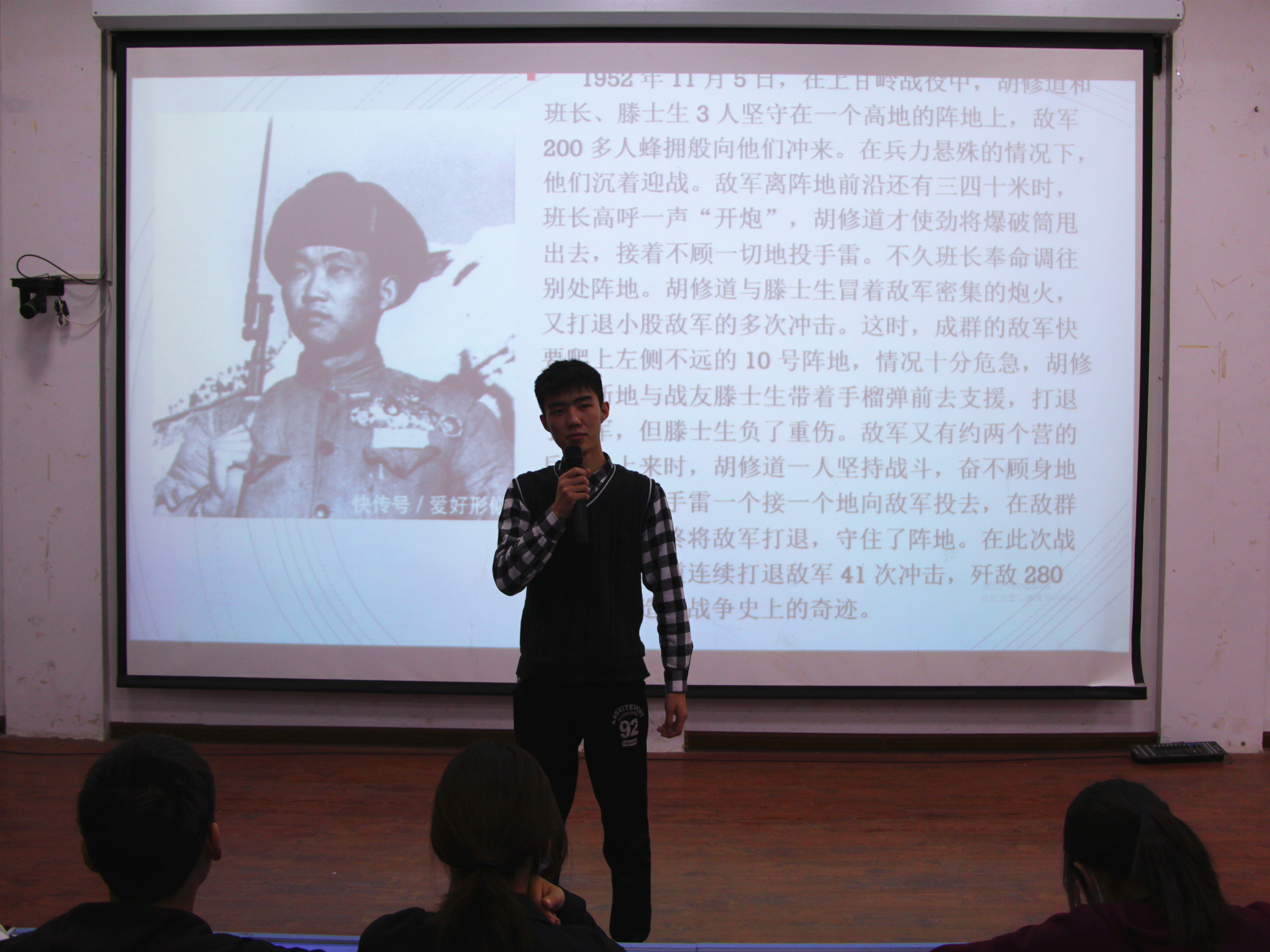 在故事会上,参赛选手们深情讲述了抗美援朝时期的重要历史事件及意义,回顾了那个年代的艰苦岁月与英雄们的不朽事迹。告诫同学们不能忘记历史,要时刻谨记红色使命,不忘初心,做一个顶天立地的中国人。故事会中,杨根思、黄继光、邱少云、毛岸英、罗盛教、张桃芳等英烈们的事迹如雷贯耳,他们不仅代表了老一辈革命军人牺牲自我、无私无畏的奉献精神,更代表了中华民族勇于抗争、不屈不挠的顽强性格。他们是现代社会每一位年轻人都要学习崇拜的榜样,也是我们每一个中国人都要感恩铭记的英雄。经过选手们一个多小时的精彩讲述和评委们的认真评判,最终本次故事会总决赛的桂冠由19电信101支部的冯阿康同学摘得。