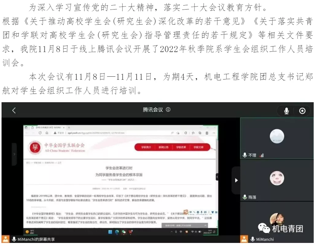 为深刻领悟党的二十大内涵,规范工作作风,提高我校学生会工作人员的思想认知,健全学生会组织全体工作人员培训制度,增强共青团对学生会指导管理的责任感,全面落实从严治会要求,2022年11月我校开展了2022年秋季学期校院两级学生会工作人员线上培训,其中校院两级学生会全体工作人员参与了此次培训。