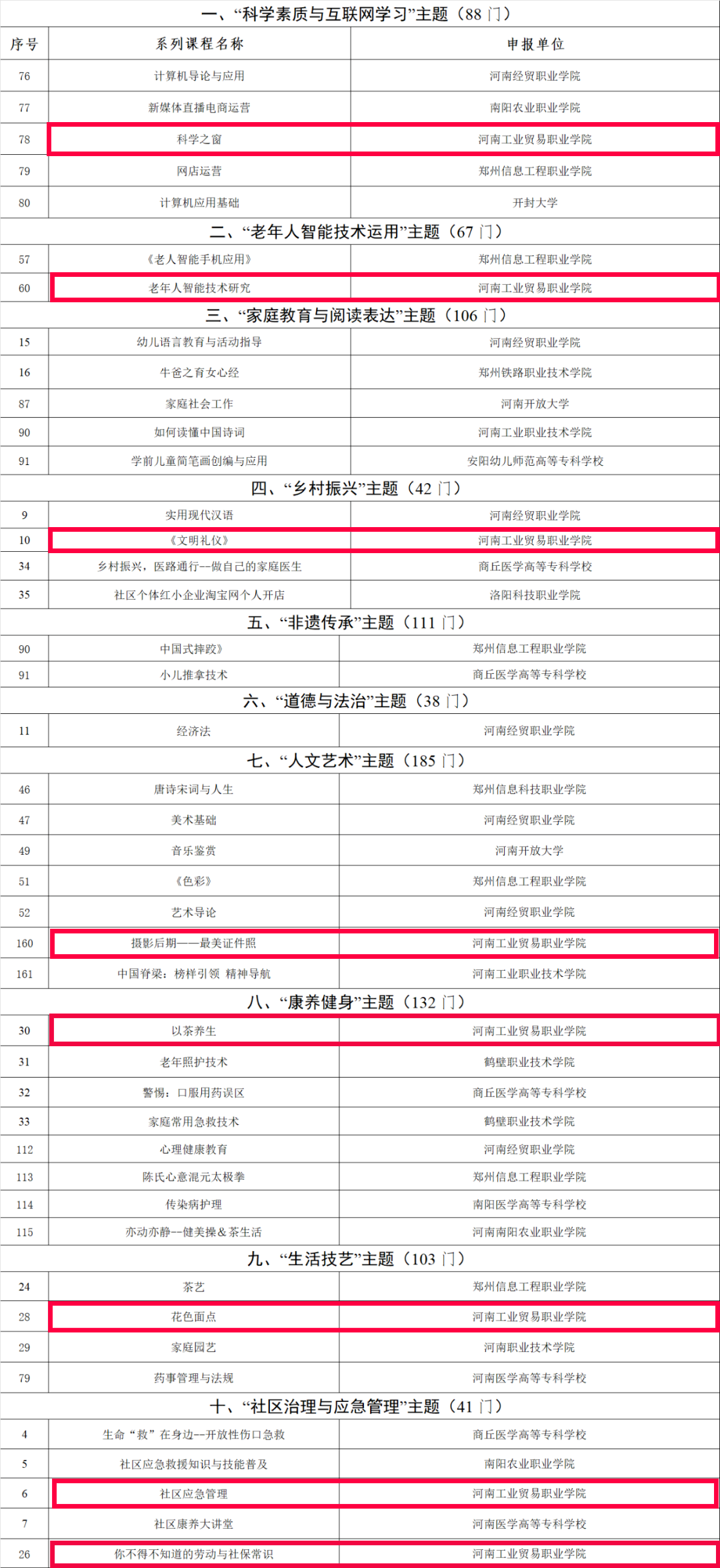 11月24日,教育部职业教育与成人教育司发布了《关于社区教育“能者为师”系列特色课程首批推介名单的公示》,共913门系列课程,其中河南高校共入选43门。我校推荐上报的课程共8门入选,涵盖“科学素质与互联网学习”、“老年人智能技术运用”、“乡村振兴”、“人文艺术”、“康养健身”、“生活技艺”、“社区治理与应急管理”等主题,实现了继续教育和社区教育教学研究的新突破。