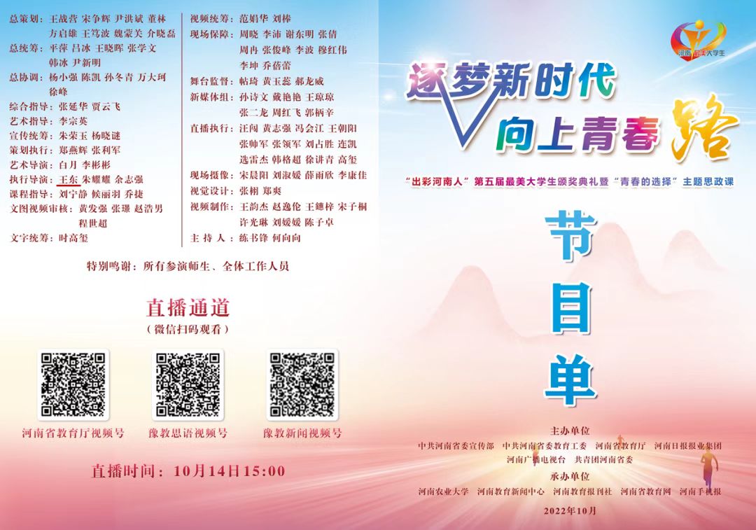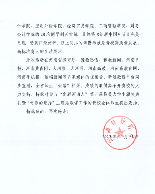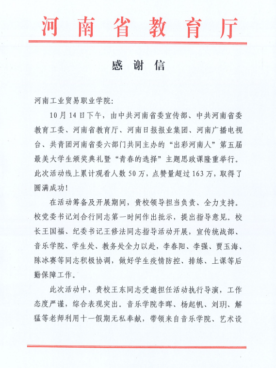 信中指出,由中共河南省委宣传部、中共河南省委教育工委、河南省教育厅、河南日报报业集团、河南广播电视台、共青团河南省委六部门共同主办的“出彩河南人”第五届最美大学生颁奖典礼暨“青春的选择”主题思政课活动,线上累计观看人数50万,点赞量超过163万,取得了圆满成功。