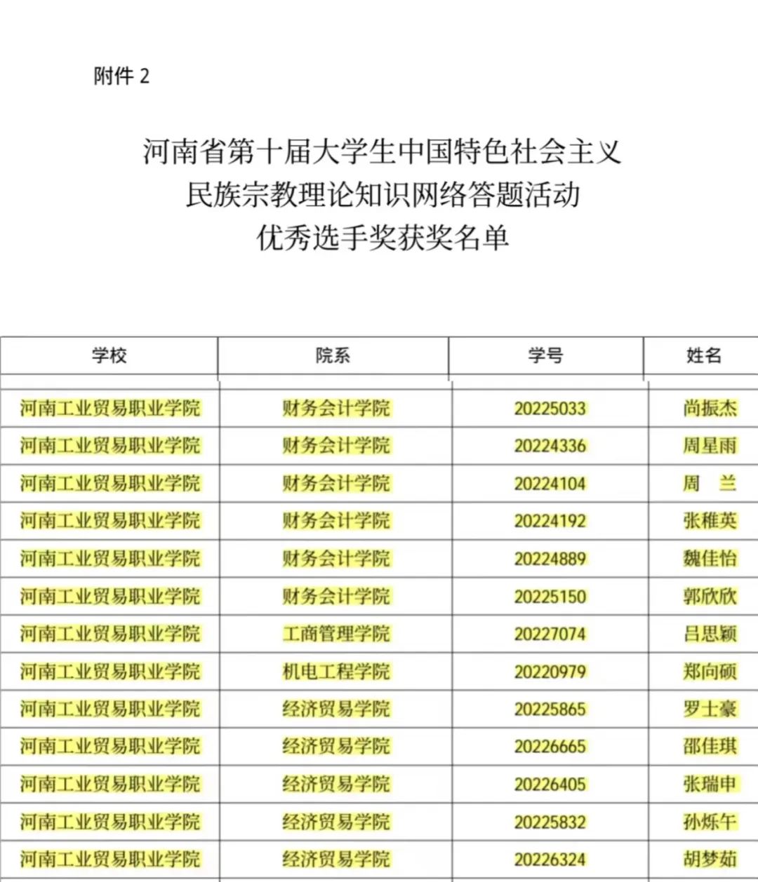 2022年12月30日,中共河南省委教育工作委员会 河南省教育厅发布《关于公布民族宗教理论知识网络答题活动和主题演讲比赛结果的通知》[豫教工委〔2022〕161 号]文件,我校斩获多个奖项,其中:在“河南省第十届大学生中国特色社会主义民族宗教理论知识网络答题活动”中,我校荣获“优秀组织奖”,尚振杰等13名学生荣获“优秀选手奖”;在“中华民族一家亲 同心共筑中国梦”主题演讲比赛中,王婷婷同学演讲作品《中国一家人》荣获“三等奖”。