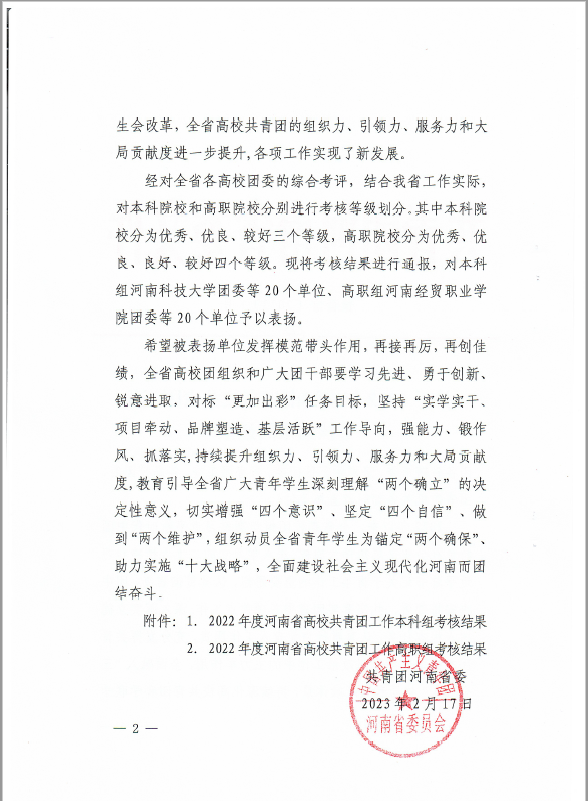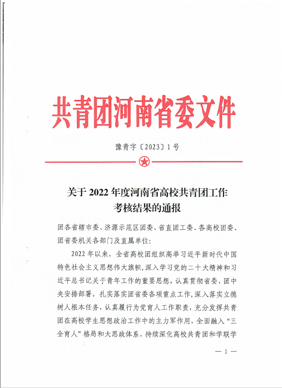 近日,共青团河南省委印发《关于2022年度河南省高校共青团工作考核结果的通报》(豫青字〔2023〕1号),我校荣获“优秀”等级。