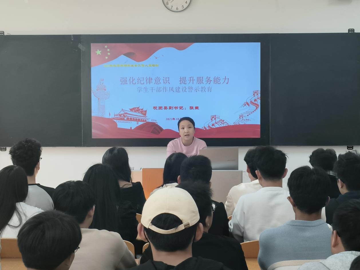 校团委副书记张薇以《学生会工作警示教育》为主题,引领学生会工作人员学习了改进作风服务同学的具体内容,会上提出学生会组织纪律的有关要求进行自查自纠,从坚持从严治会等方面进一步加强组织管理和工作人员作风的建设。还指出全体学生会工作人员要以“全心全意为同学服务”为宗旨,严格自律、勤勉奋斗,努力做到守纪律、讲原则、作表率,在服务同学开展各类工作的过程中做到甘于服务和奉献的精神,明确自身责任,脚踏实地,不搞形式主义,严禁官僚主义和官僚思想。