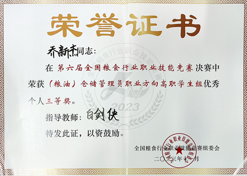 11月13日至15日,第六届全国粮食行业职业技能竞赛决赛在广西南宁举行,来自全国30个省份34支代表队、322名选手参加了决赛。我校副校长刘卫红亲自带队,职业技能鉴定中心主任李玉红等人随行。经过两天的激烈角逐,由我校粮食工程学院白剑侠老师指导的学生乔新杰斩获(粮油)仓储管理员职业高职学生组三等奖,实现我校该类奖项零突破。