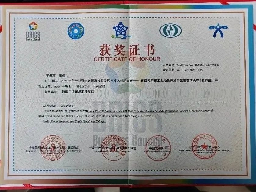 10月22日至25日,2024一带一路暨金砖国家技能发展与技术创新大赛首届元宇宙工业场景开发与应用赛项决赛在商丘职业技术学院举行,我校教师王强、李景辉荣获教师组一等奖,我校荣获最佳组织奖。