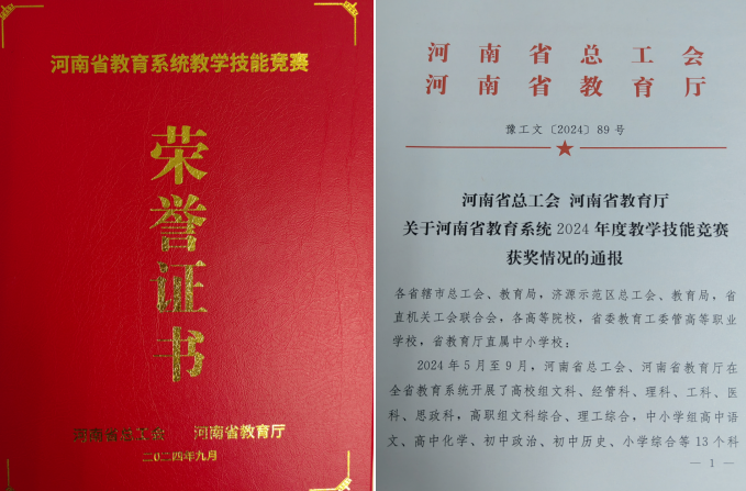 11月4日,喜讯传来,由河南省总工会、河南省教育厅在全省教育系统开展的2024年度教学技能竞赛结果揭晓,我校参赛的两位教师凭借稳固的专业技能、革新的教学方案和具备感染力的课堂表现获得了评审专家的一致认可。机电工程学院张立老师获得高职理工综合二等奖,艺术设计学院蔡怡菲老师获得高职文科综合二等奖。