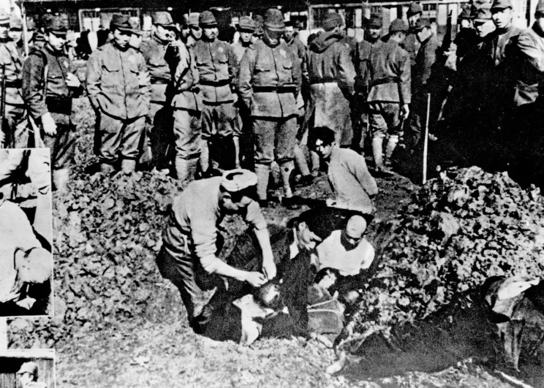 这是日军在南京大屠杀中拍摄的一个镜头:刽子手们挥舞刺刀将1500名我国同胞一一刺死。