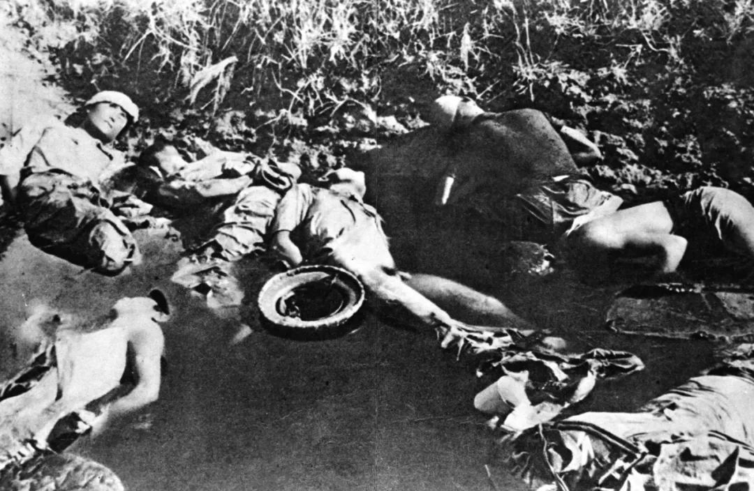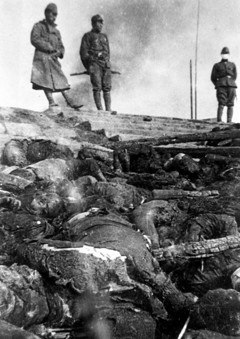 图为在南京大屠杀中,日军把300多名无辜的中国人反绑双臂枪杀后,掷入城郊池塘。