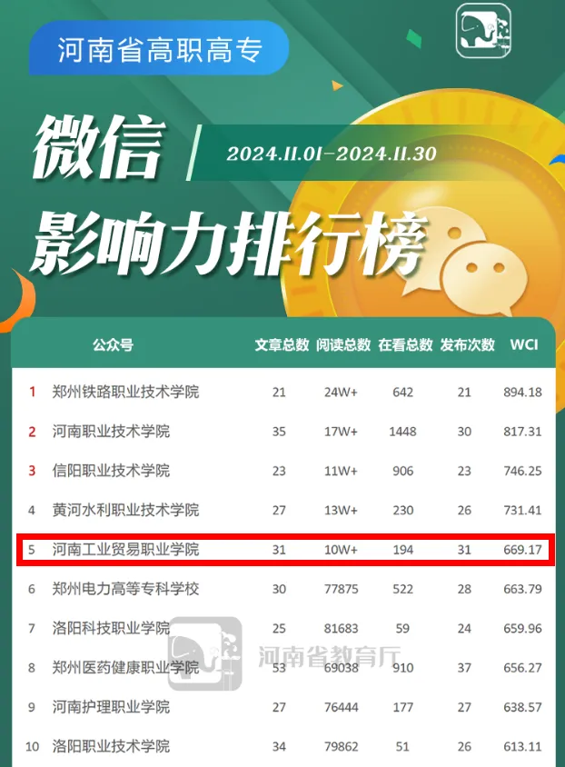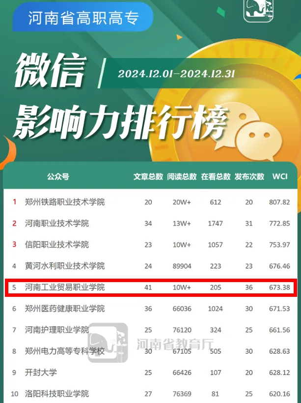 近日,河南省教育厅发布河南省教育系统2024年12月新媒体综合传播力排名。我校微信公众号影响力排名位居河南省高职高专院校微信影响力排行榜第五,这是我校微信公众号连续两个月位居河南省高职高专院校微信影响力排行榜第五。快手号影响力排名位居河南省高职高专院校快手影响力排行榜第四。