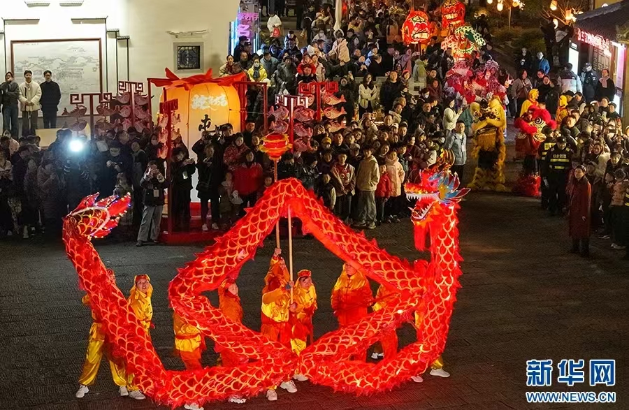 当日,一场热闹非凡的民俗巡游踩街活动在安徽省黄山市屯溪河街精彩上演,屯溪布龙、瞻淇鱼灯等徽州民俗轮番登场,吸引众多市民游客围观,在欢声笑语中感受浓浓年味。新华网发(施亚磊 摄)