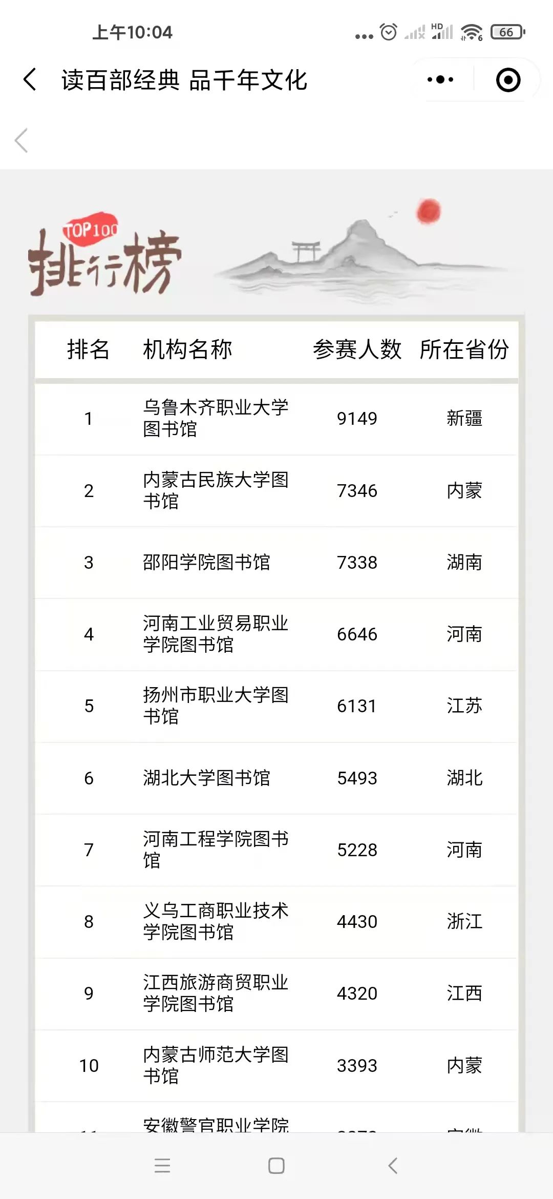 本次活动由“共享悦读”微书评荐书、“阅读之星”评选、《百部经典》阅读打卡、“经典有声”原著诵读展示、“百部经典·百题大闯关”传统文化知识竞赛、朗读者六部分组成。其中由国家图书馆、中国图书馆学会举办的“读百部经典品千年文化”——《中华传统文化百部经典》校园行活动,同学们积极参加,坚持每天阅读打卡,读原著,参与传统文化知识竞赛,截至目前我校参加活动人数共6646人,在全国排名第四,河南省排名第一。