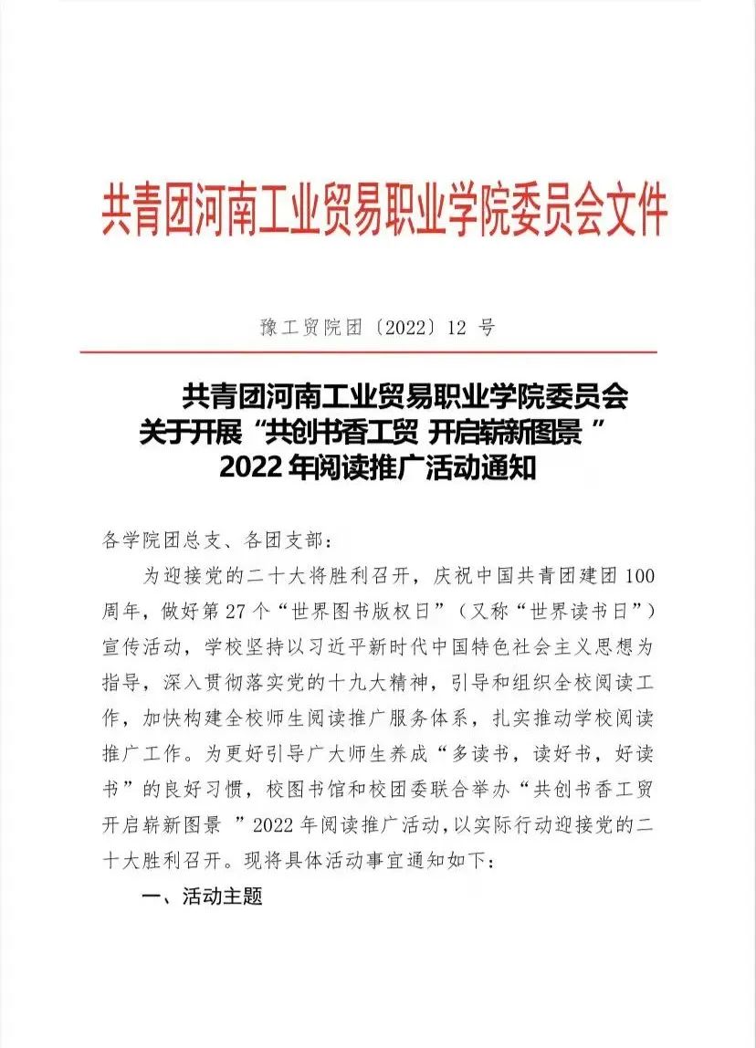为认真贯彻落实党的十九大关于开展全民阅读活动的重大部署,迎接党的二十大召开;在校党委委员、副校长刘卫红安排部署下,校团委联合图书馆积极开展了“共创书香工贸 开启崭新图景 ”2022年阅读推广活动,努力在全校形成“多读书、读好书”的优良风尚。