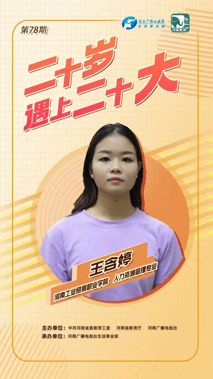 王含婷,河南工业贸易职业学院人力资源管理专业学生,现任星光演艺社团副社长、工商管理学院团总支副书记、学生会主席团轮值主席。品学兼优,一直欣赏“学无止境”的格言。功夫不负有心人。在2021-2022学年学习成绩取得本专业排名第一的优异成绩,获得“优秀团干”“三好学生”等荣誉称号。学习之余,积极投身志愿服务工作,在抗击疫情的志愿者工作中,她践行“助人助己,乐人乐己”的口号,让自己的眼界更加开阔,心灵更加清澈。并荣获“优秀疫情防控志愿者”荣誉称号。