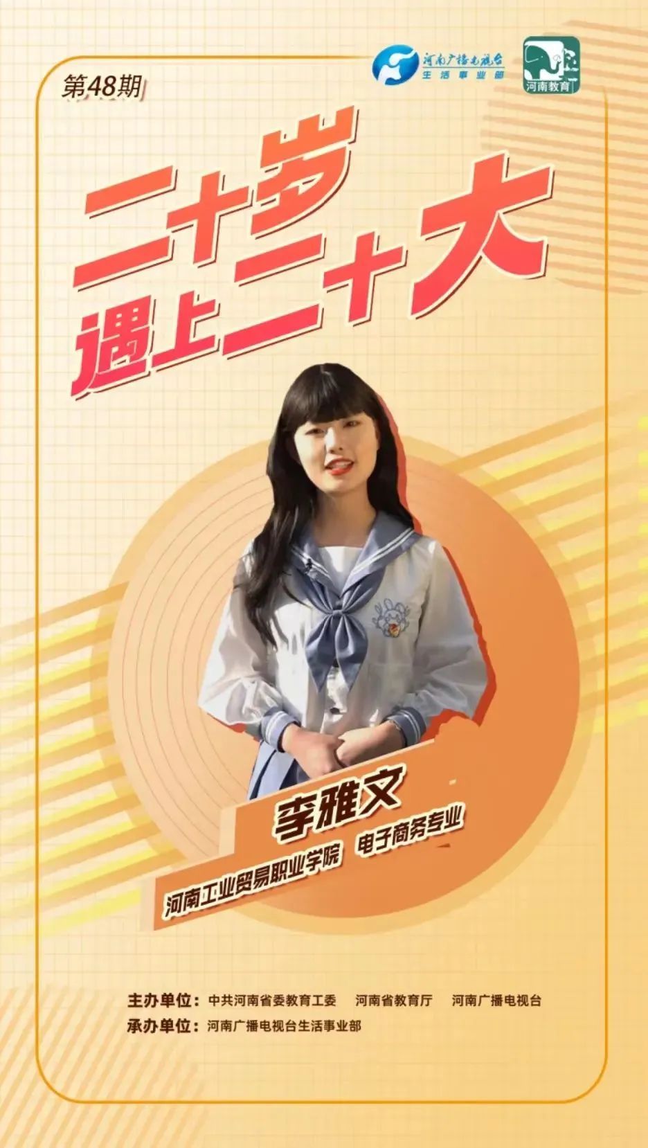李雅文,河南工业贸易职业学院,电子商务专业学生。2020年荣获河南省中等职业学校省级三好学生,2019—2020学年荣获中等职业教育国家奖学金。
