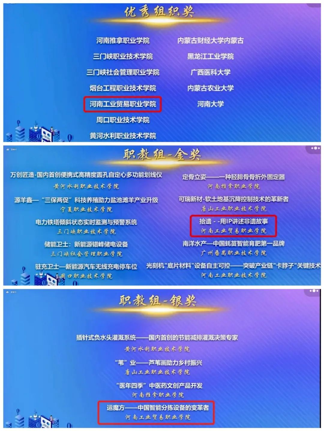 移动互联创新大赛自5月启动以来,受到各高院的广泛关注,本次比赛共有千余个项目报名参赛。7月,四大赛区进行线上复赛评选,我校“拾遗——用 IP 讲述非遗故事”“运魔方——中国智能分拣设备的变革者”“在线‘智’量系统”三个项目团队分别荣获中南部赛区金、银、铜奖。按照大赛规则,各分赛区金、银奖项目入围全国总决赛。