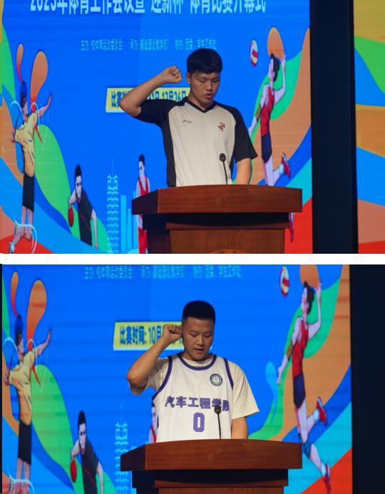 基础理论教学部主任杨素梅宣读2023年“迎新杯”体育比赛通知,裁判员代表基础理论教学部教师吴科科、运动员代表汽车工程学院学生邓赵杰相继宣誓。