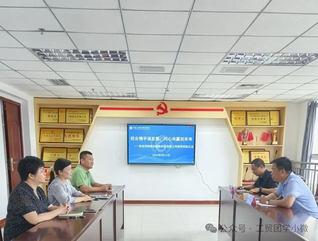 2025 年 8 月 15 日,河南琪驭智能科技有限公司一行莅临河南工业贸易职业学院机电工程学院,开展校企合作回访交流活动。双方围绕学生实习就业、共建实训室、导师互派、共建教材等关键议题展开深入探讨,旨在进一步深化校企协同育人机制,实现资源共享、优势互补,为培养高素质技术技能人才奠定坚实基础。