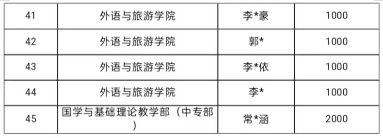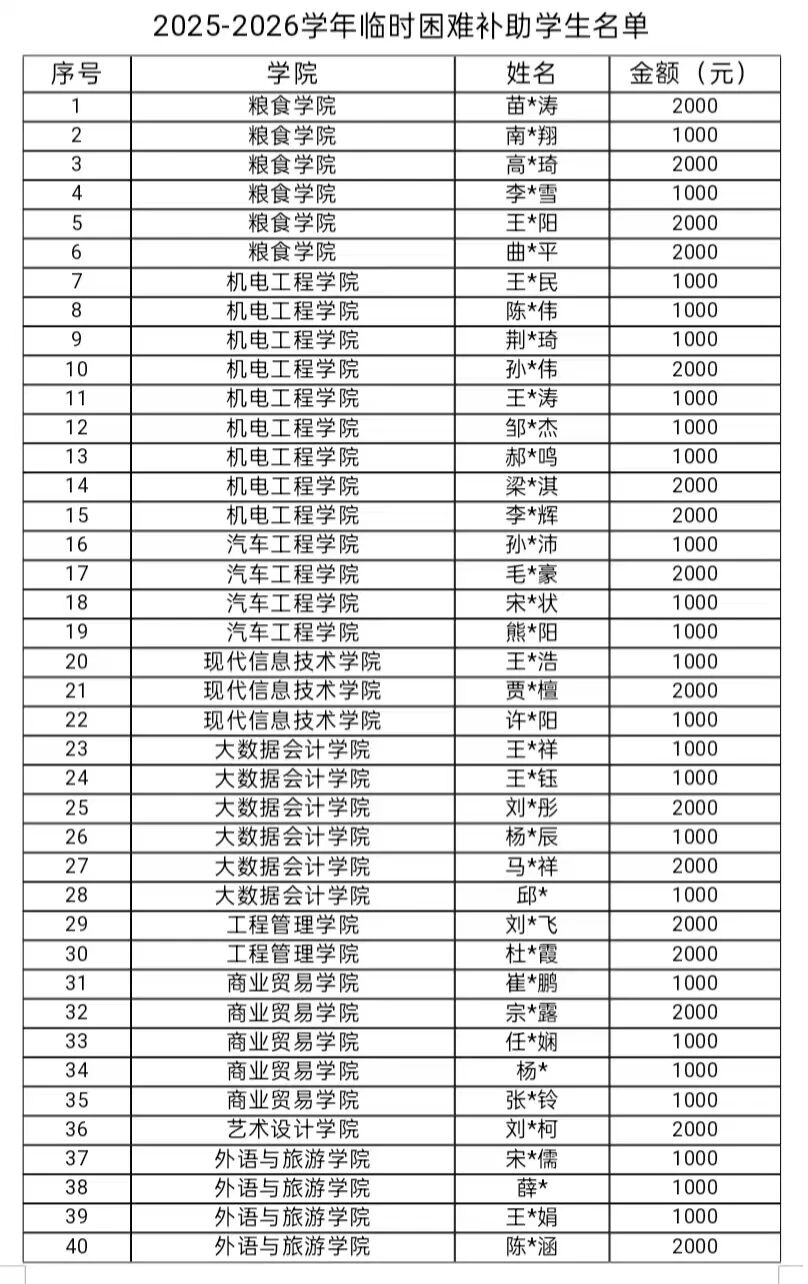 根据学校关于印发《河南工业贸易职业学院学生临时困难补助管理办法(试行)》的通知(豫工贸院〔2023〕173号)文件精神,经学生本人申请、学院(部)审核、党委学生工作部复核、学校困难学生资助管理委员会研究审批,共有45名学生获批临时困难补助。现将学生名单进行公示,如有疑议,请在公示期间口头或书面形式向党委学生工作部学生资助中心反映。