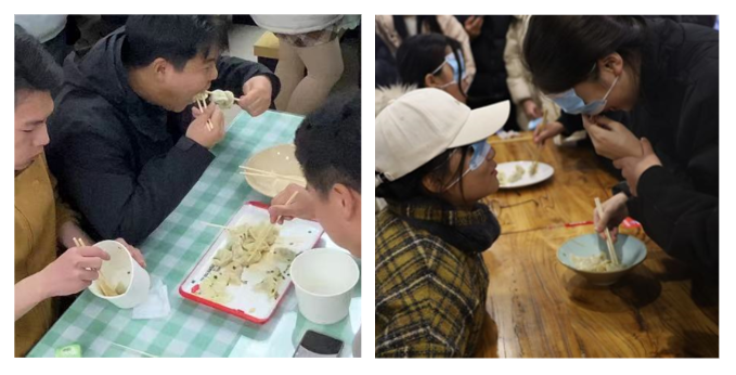 考验朋友间相互配合的蒙眼吃饺子比赛,三人一组。现场参赛人员齐聚一堂,摆开阵势,为接下来的比赛出谋划策,分配小组任务。有的吃、有的喂、有的指导,使同学们在寒冷的冬天感受到温暖。同时在同学们激烈的欢呼声中,比赛也决出了获胜的队伍。