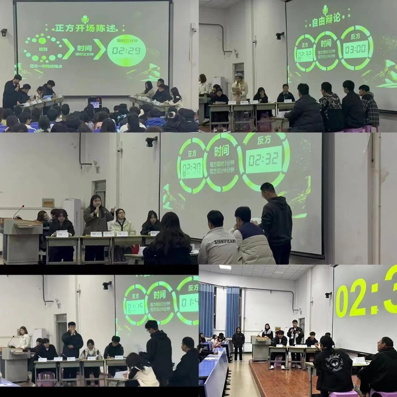 本次辩论赛分为开场立论、辩驳理论、自由辩论、总结陈词,观众提问五个环节。