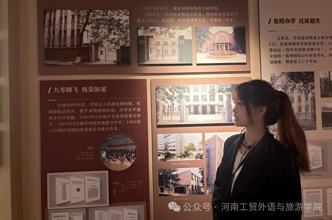 在汉服迎宾环节,外语学子们身着传统汉服迎接来自全国各地的贵宾,她们将汉服古典、含蓄之美演绎得淋漓尽致,也成为大赛的一道靓丽风景。同时,学院选派优秀学生参与校史馆和粮博馆讲解工作,同学们以专业的讲解生动传递了学校浓厚的粮食文化底蕴。