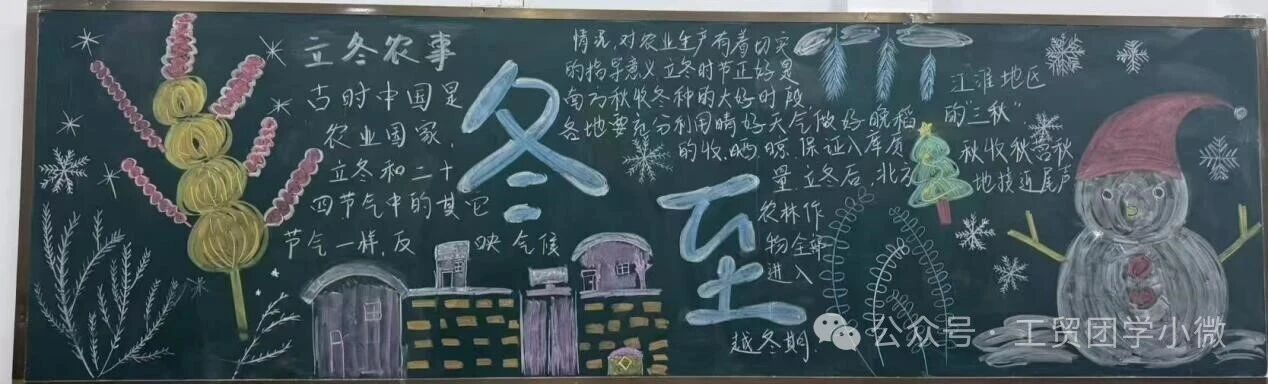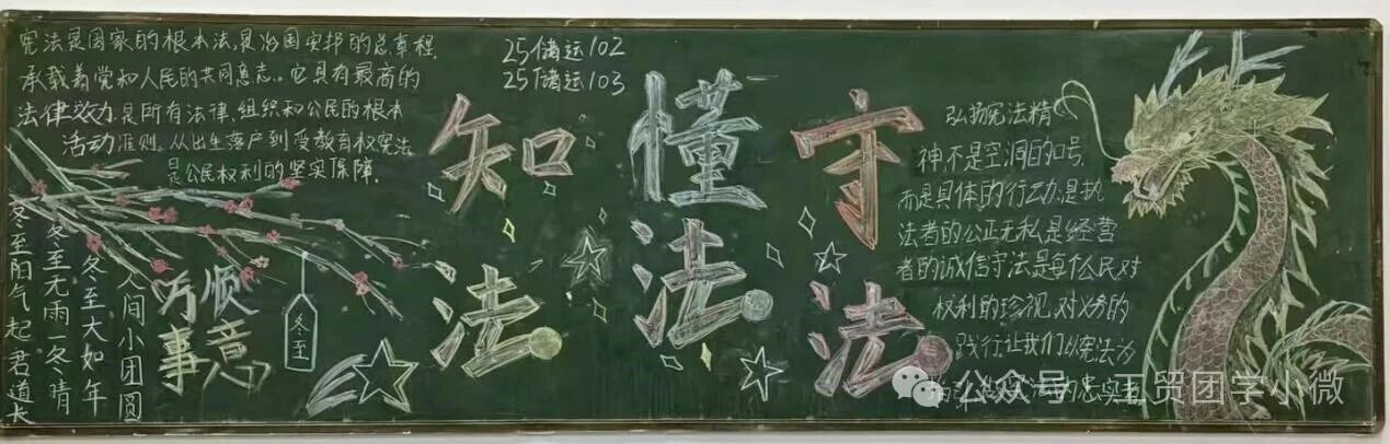 本次活动设置冬至民俗文化与宪法精神宣传两大主题,各二级学院学生自主选题、精心构思。创作的过程,同学们以冬至民俗元素在黑板上勾勒出冬日的温情画卷;学校也借助板报活动向学子弘扬宪法精神、播撒法治种子,为社会主义法治文化建设注入青春血液。