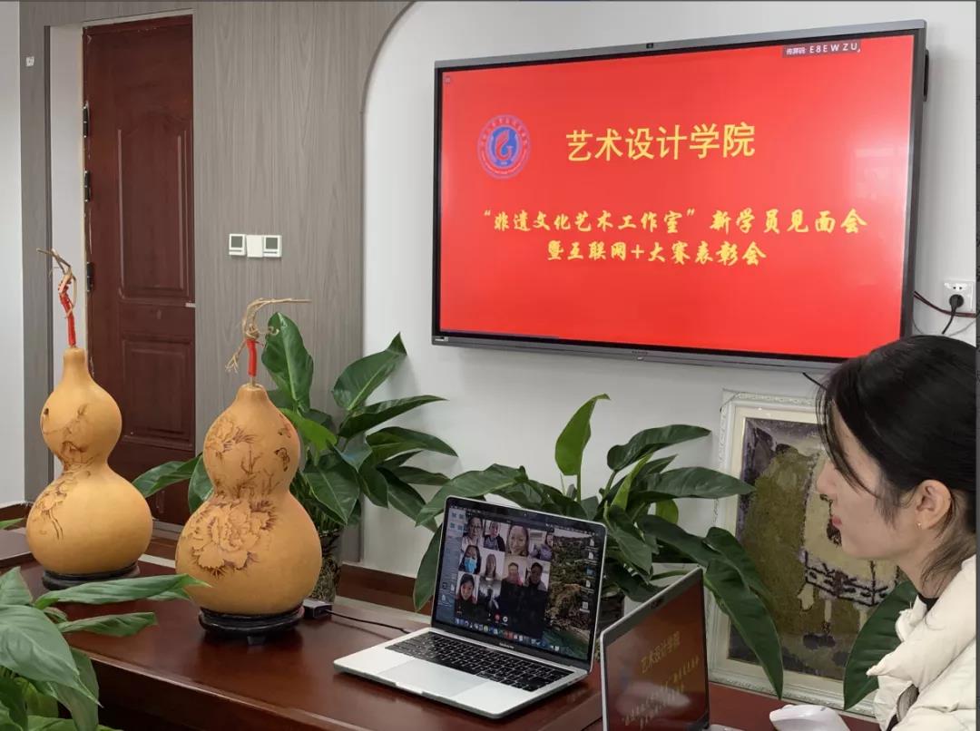 2021年11月8日中午12点40,我院在A9008会议室召开了新学员见面会,同时隆重举行“移动互联大赛”表彰会。艺术设计学院段文花院长、非遗大师翟志伟(线上)、彭超副院长、非遗工作室负责人张盼盼老师、相关老师(部分老师线上),以及工作室全体学生共50余人参加本次会议。