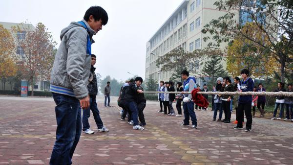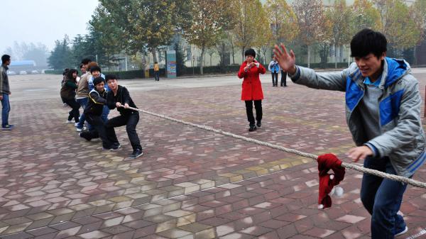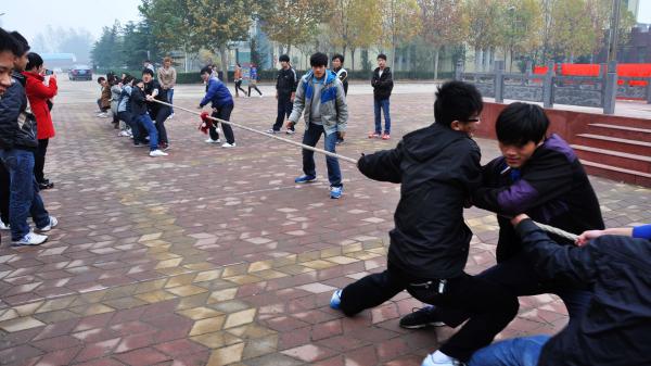 比赛中每个班除了参赛的10名同学外,其余的同学都主动组成拉拉队为班级加油。随着一声令下,11计应101班与11计应102班的比赛开始了。双方队员握紧绳子,他们一个个脚蹬着地,身体向后倾,拼命向自己的方向拽绳子。绳子中间的红绸带一会儿偏左、一会儿偏右,互不相让。双方啦啦队的队员们,也齐声呐喊,不停地为自己队擂鼓助威,大有要从气势上压倒对方的魄力。双方僵持不下,个个拉红了手都不愿放松。此时,站在旁边的辅导员老师说了一句:“拔河拔的不是蛮力,必须随着号令再一起使劲儿。”掌握技巧的11应用101班势如破竹,连下四城,取得最后的胜利。不管是赢得班级还是输的班级大家都在一起说说笑笑,欢呼声一浪高过一浪。
