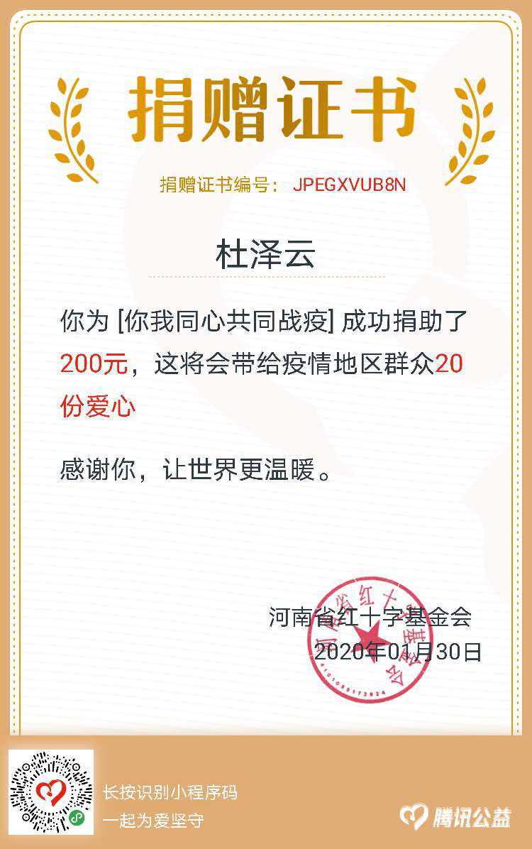 工商管理系杜泽云副主任用行动诠释——你我同心共同战疫,向河南省红十字会捐款200元,用于疫情地区的防护。