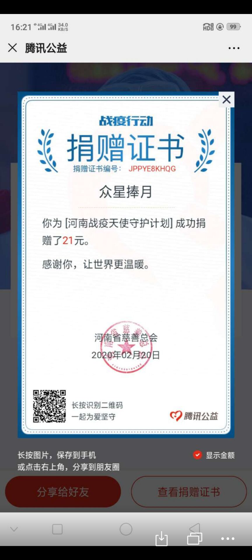王梓萌同学在河南慈善总会上为抗疫捐款21元。捐出浪漫的寓意,2是‘爱’、1是‘你’组成的词是‘爱你’,爱你中国、爱你武汉。