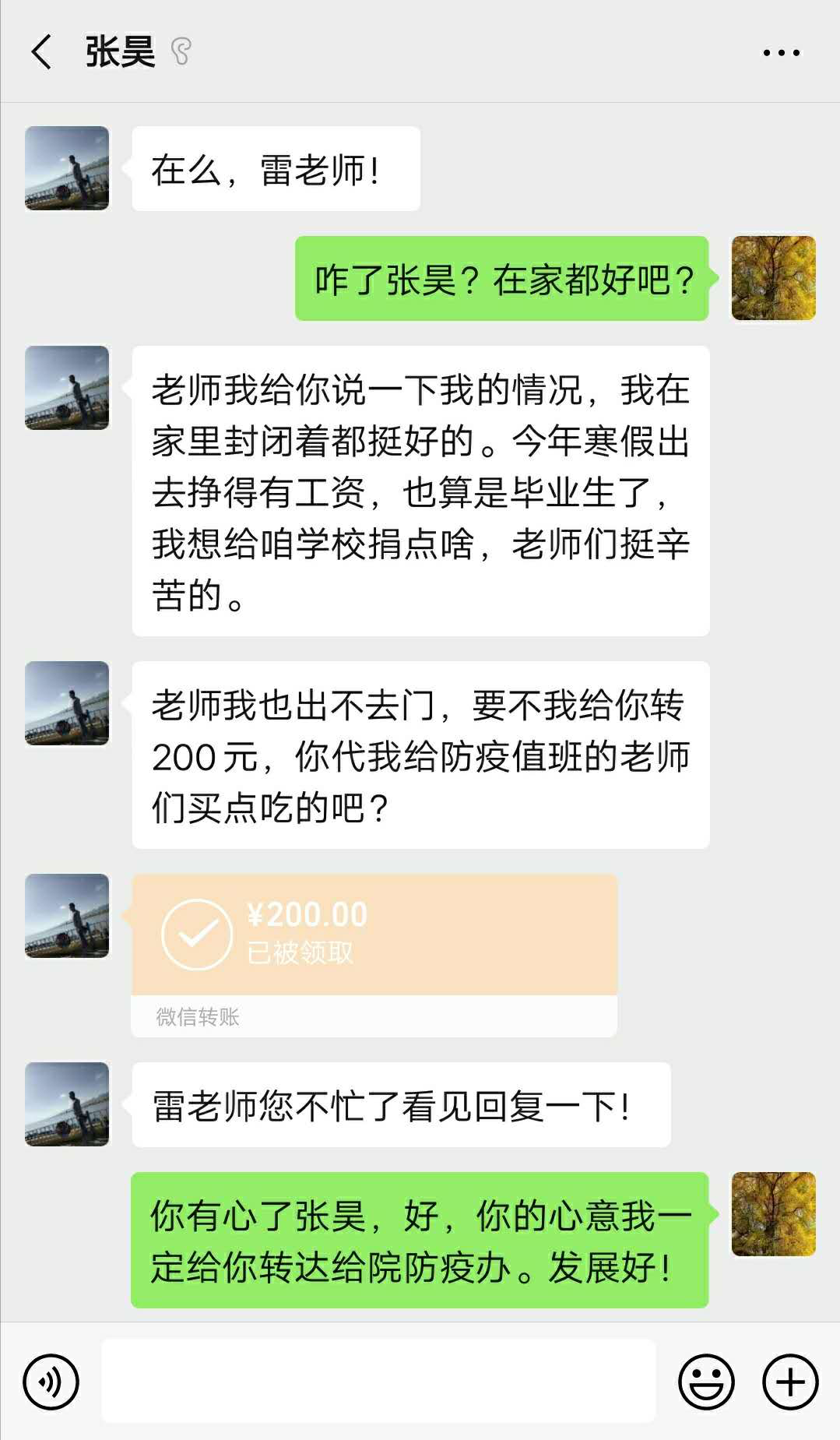 李盈昊同学家中从事医疗卫材器械行业,疫情发生后,家人在全力配合物资生产供应任务外,专门预留库存产品并采购物资捐献给学校,学生家长在场反复交待:“学校为了校园师生安全付出很多,后续物资若不够,我们再想办法筹集。”张昊同学是系学生党支部的一名预备党员,在校期间曾任院、系青年志愿者组织主要学生干部,寒假打工返回后,目前在坤达祥龙城家中隔离居住,专门委托老师采购食品移交给防疫办。