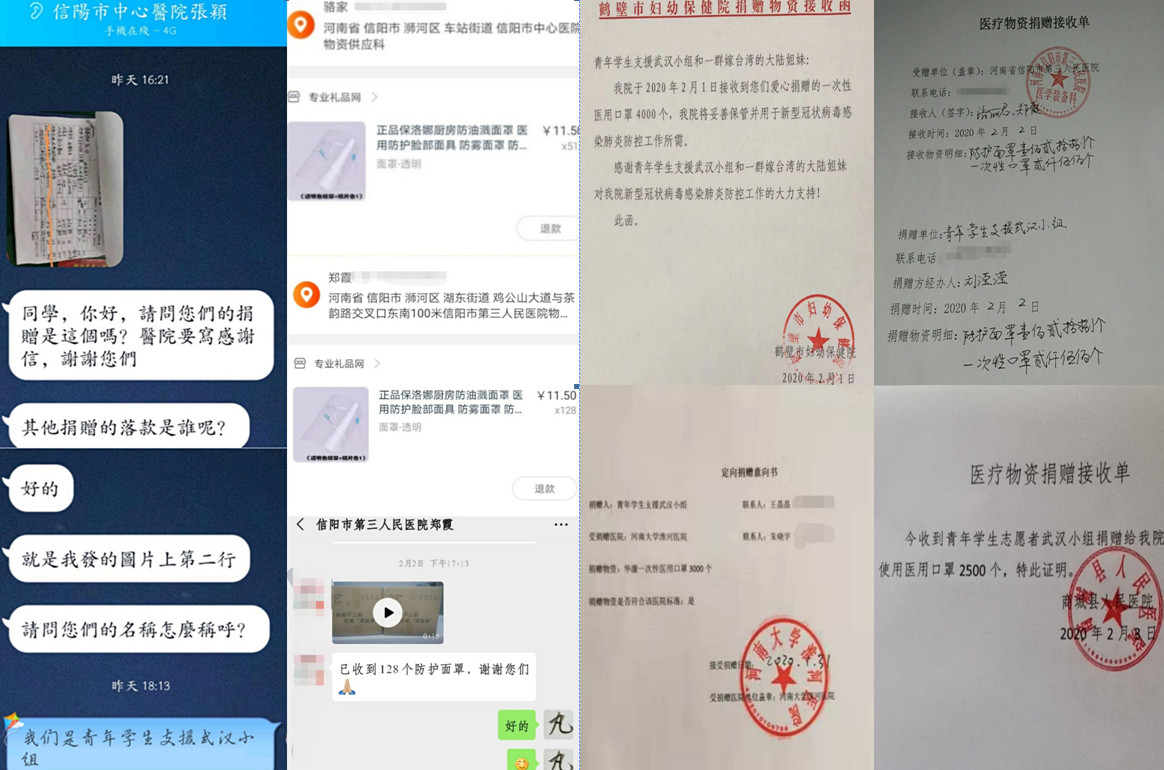 自2020125日起,河南工业贸易职业学院学生刘滢滢与河南大学、郑州大学、信阳师范学院、黄河科技学院的学生,以及部分社会人士,自发组织青年学生支援疫情小组。小组内部进行明确分工,分别是宣传与新闻组、督查与审核组、运作与货源组、外联与咨询组、组织与策划组。截止至202021日,共收到将近40000元善款,其中包括嫁至台湾的大陆姐妹委托捐款17000元,购买物资剩余3213.91元,以资金方式捐赠北京韩红爱心慈善基金会。此次共捐赠四批物资,包含防护面罩640套,一次性医用口罩18000个,分别捐赠给湖北省利川人民医院、河南大学淮河医院、信阳市中心医院、信阳市第三人民医院、商城县人民医院、鹤壁市妇幼保健院。
