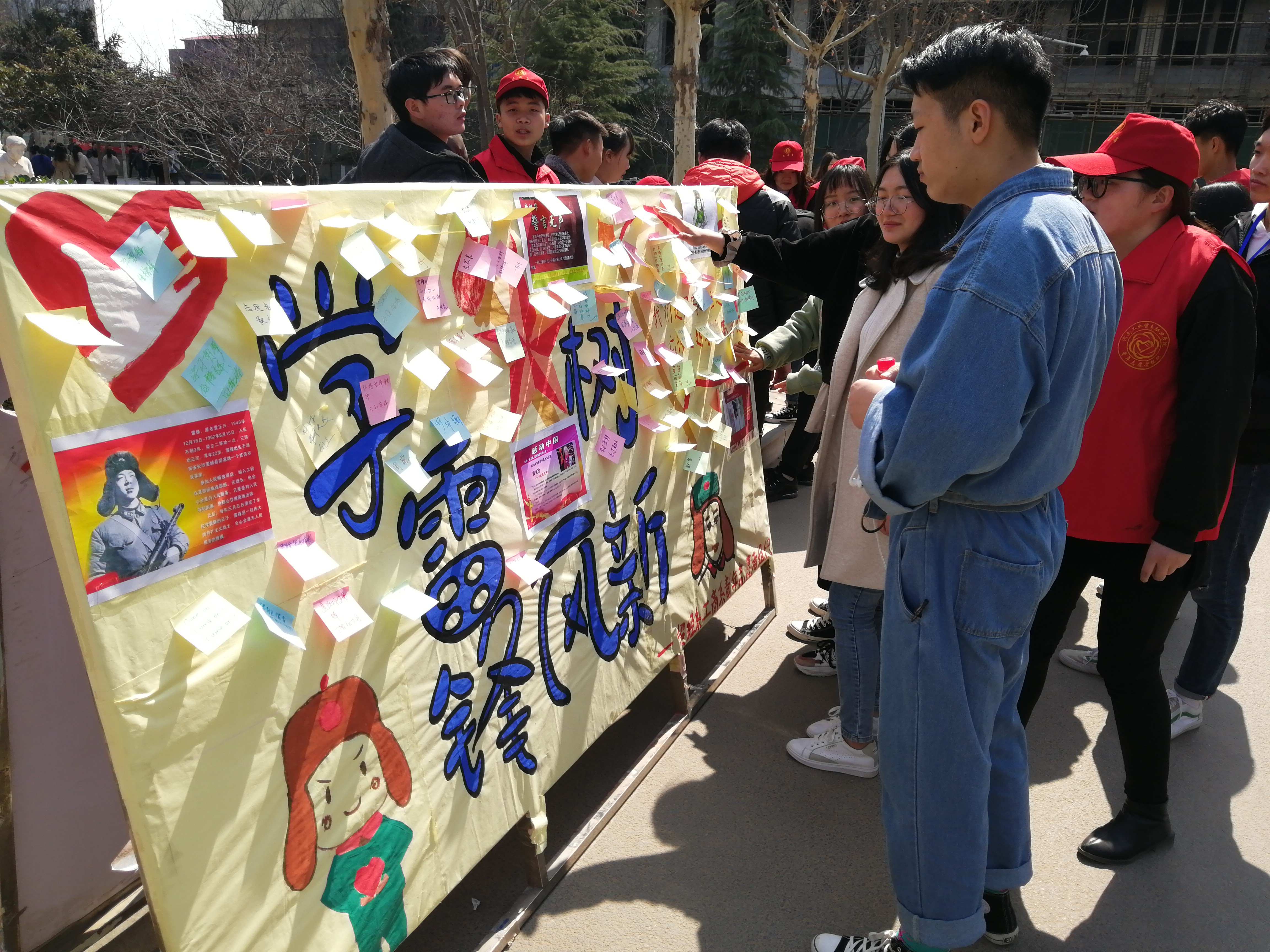 3月7日,贸易经济系青年志愿者联合工商管理系青年志愿者在工贸校园举行了以“弘扬雷锋精神 建设美丽校园”为主题的志愿服务活动。放学铃声响起,同学们远远地就看到了西餐厅旁的帐篷。很快,活动现场围了好多人。经过志愿者们的讲解,同学们陆续的开始在便利贴上写上对雷锋月的美好祝福,以及自己的理想。最后把自己的愿望粘贴在展板上。值得一提的是,展板上的第一个便利贴愿望是:“学习雷锋精神,从自身做起”。