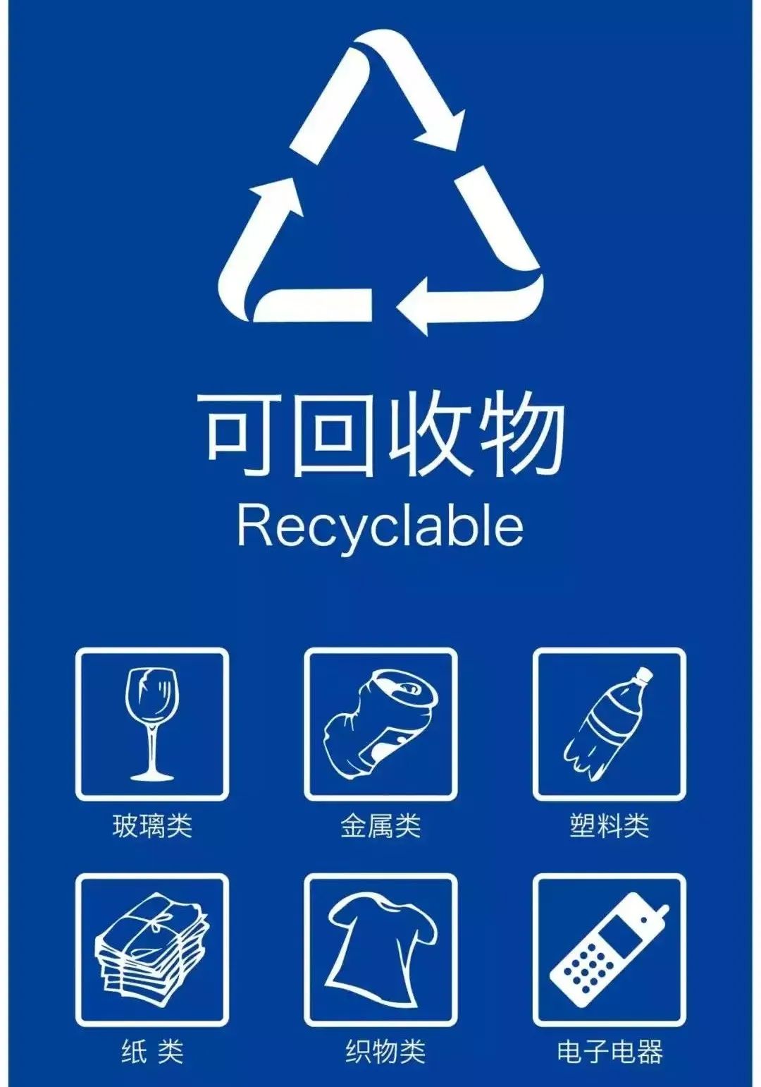可回收物(再生资源)是指回收后经过再加工可以成为生产原料或者经过整理可以再利用的物品,主要包括废纸类、塑料类、玻璃类、金属类、电子废弃物类、织物类等。