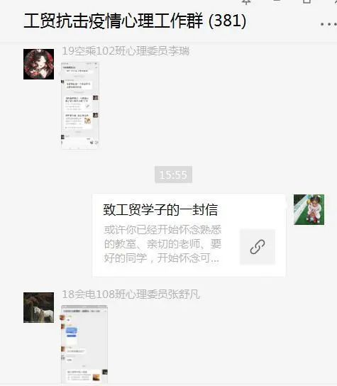 工贸抗击疫情心理工作群是学院心理中心监控全院学生心理健康状况的有效平台,也是向学生发布心理健康信息和学院最新动态的有效路径。心理中心的老师定期会在工作群中推送心理健康知识和疫情防控知识。心理委员也会第一时间将班级同学的动态发送给心理老师,并在群中营造“人人助我,我助人人”的氛围,以理性平和的良好心态应对学习、生活上的问题,积极度过疫情防控特殊时期。