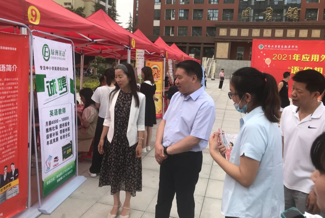 莘莘学子展才华百鸟争鸣,藏世伯乐觅英才慧眼识珠。为做好毕业生就业保障工作,为社会输送优秀人才,在校党委的正确领导下,在校就业指导处的大力支持下,6月3日下午,“河南工业贸易职业学院应用外语学院2021年校园双选会”在红旗广场隆重举行。本次双选会吸引了20余家用人单位到场,累计提供就业岗位200余个,我院400多名毕业生到场应聘。我校党委书记刘合行亲临现场了解双选会情况,并与用人单位及优秀毕业生代表进行了亲切交流。
