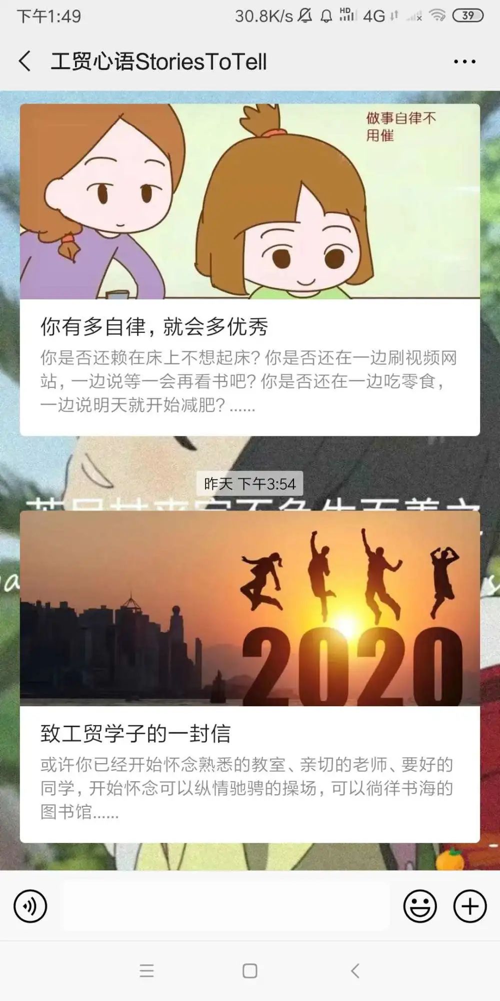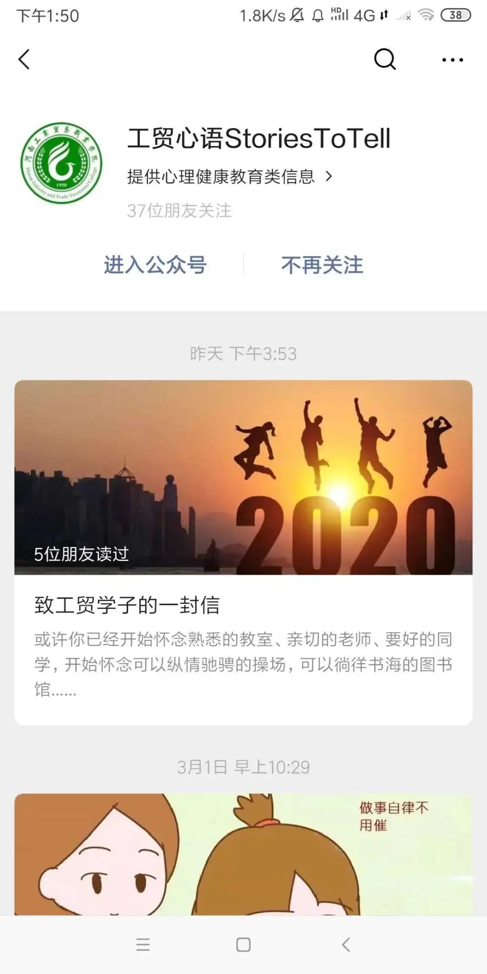 先后策划了宅家攻略、工贸心语小课堂等专栏。《网课听课指南》、《与父母相处攻略》、《战“疫”小知识有奖竞答》、《疫情来了,你恐慌吗?》、《谣言来了,你会怎么办?》、《疫情时期常见的几个心里困惑》、《疫情时期,如何应对焦虑》等涵盖防控宣传、科普宣传、心理健康教育等方面的20篇文章先后在公众号推出。用学生们喜闻乐见的形式、幽默风趣的语言将心理健康知识、日常防护小知识等内容推送到手机端。
