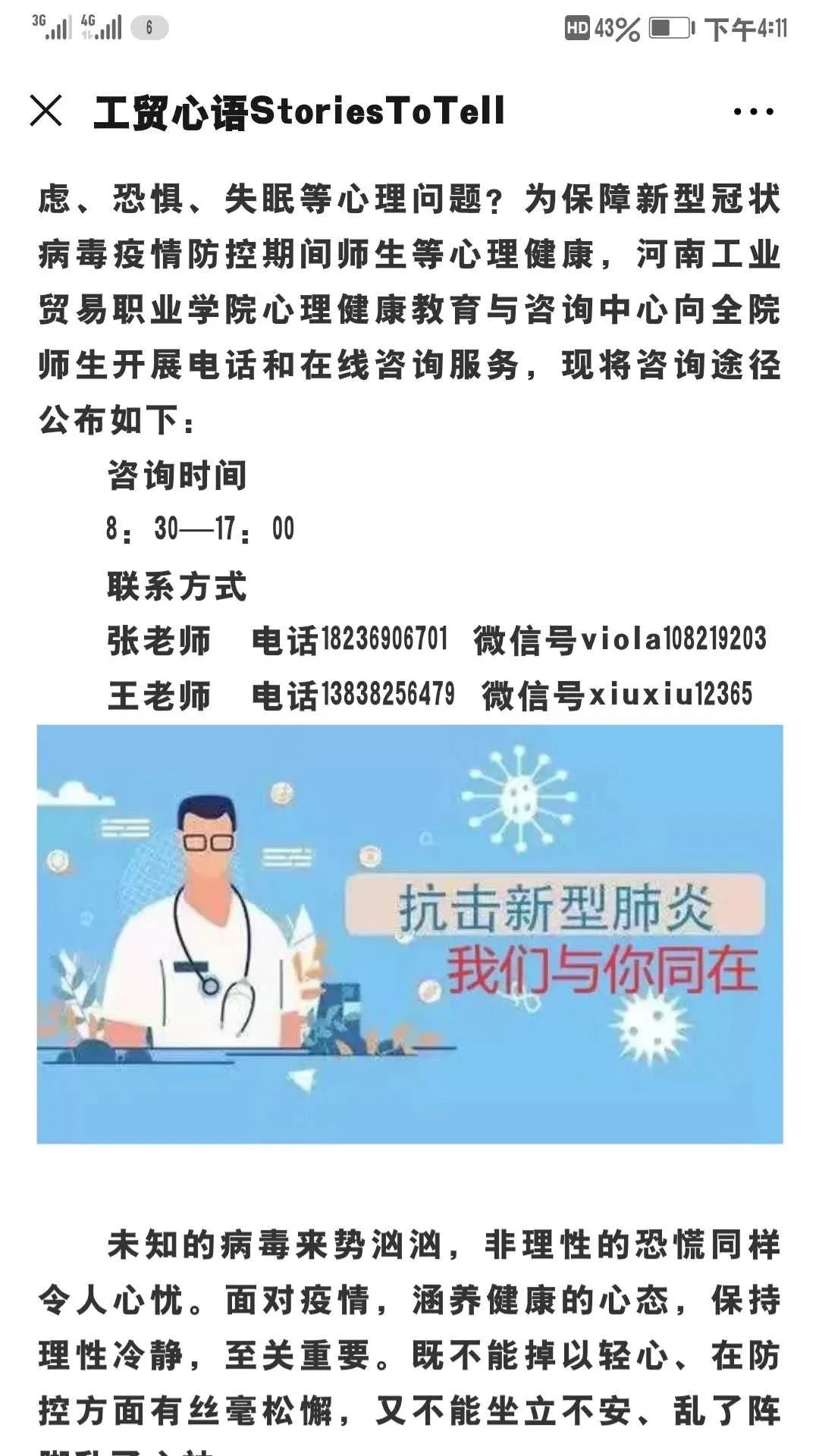 随着疫情的不断发展,给师生心理造成不小的冲击。面对疫情蔓延迅速带来的紧张、恐慌、焦虑情绪及心理压力,学院心理健康教育与咨询中心,迅速行动,组建专业心理咨询师队伍,开通工贸学院“同心战疫”心理咨询热线和网络咨询通道,疏通“点对点”咨询疏导通道,引导学生掌握科学的心理调适方法,有效应对当前疫情带来的不良情绪困扰。并于2月1日,通过中心微信公众号平台,向全院师生公布咨询途径。