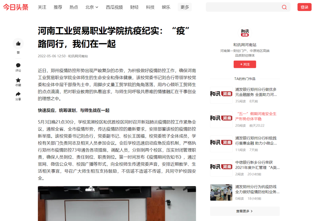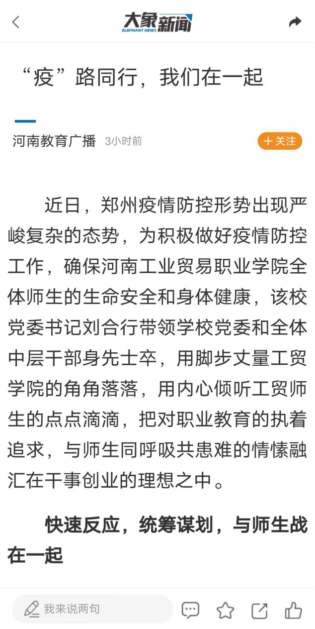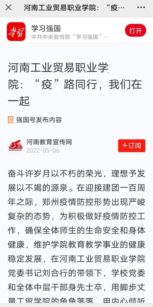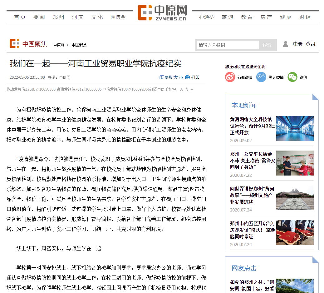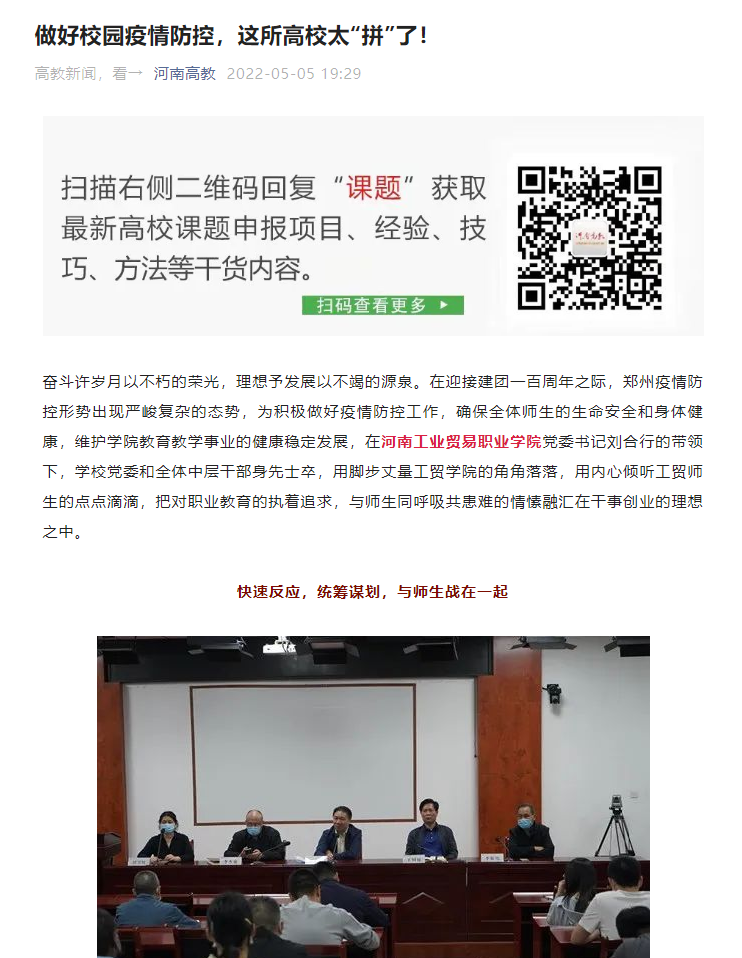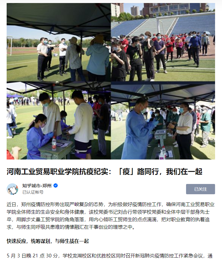 我校疫情防控措施和成效得到了学习强国、今日头条、大象新闻+河南教育广播、网易新闻、新浪新闻、中原网、河南高教、知乎城市—郑州等多家主流媒体的关注和报道,引发了良好的社会影响。