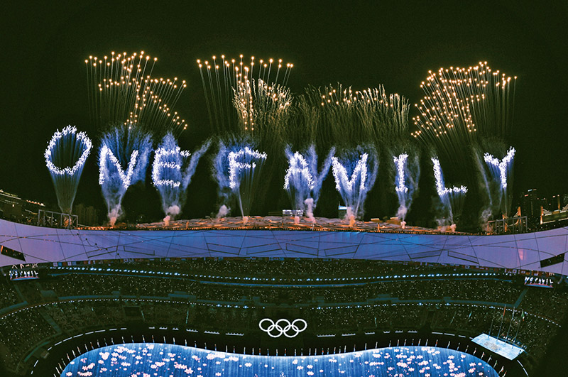 在世界百年变局加速演进、人类社会遭遇各种挑战的形势下,奥林匹克大家庭成员不远万里来华共襄盛举,“一起向未来”和“更团结”相互呼应,北京冬奥会、冬残奥会成为了一场和平友谊的盛会、一场团结合作的盛会、一场鼓舞世界的盛会。图为2022年2月20日,北京第二十四届冬季奥林匹克运动会闭幕式上的焰火在“鸟巢”上空显示出中文“天下一家”和英文“ONE FAMILY”字样。新华社记者 宋彦桦/摄